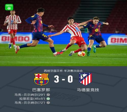 北京时间3月4日西班牙国王杯 半决赛次回合,巴塞罗那对阵马德里竞技。巴塞罗那马克-贝尔纳尔梅开二度,拉菲尼亚破门。最终比分巴萨 3-0 马竞。两回合总比分巴萨3-4马竞。